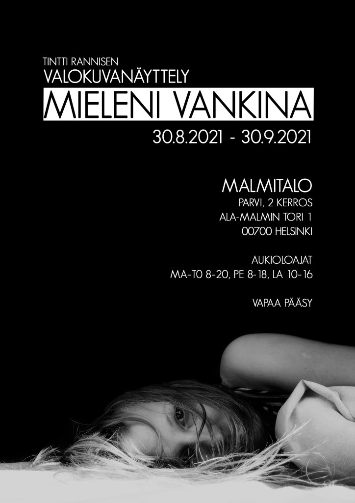 MIELENI VANKINA on ensimmäinen näyttelyni. Näyttely on hyvin pienimuotoinen ja vaatimaton, mutta aihe on sitäkin suurempi. Valokuvien ohella esillä on myös kirjoittamiani teemaan sopivia runoja, joista osa löytyy myös 2017 julkaistusta runokirjastani Pitkä ihana leikki. Valokuvat ja runot ovat kuitenkin itsenäisiä ja toisistaan erillisiä teoksia.